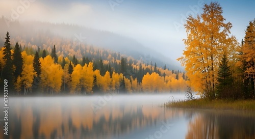 Autumnal Misty Lake Landscape.