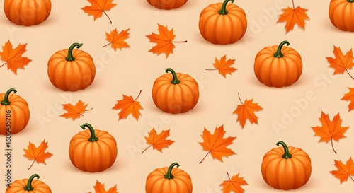 Autumnal Orange Pumpkins and Maple Leaves Pattern on Tan Background