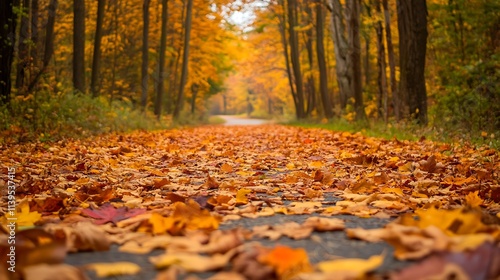 Autumnal Path Covered in Fallen Leaves. Concept of Fall, Nature, and Tranquility.