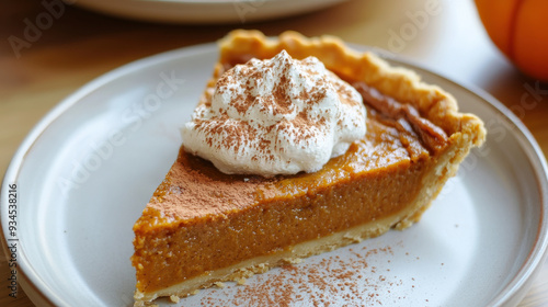 Autumnal pumpkin pie with whipped cream on top with cinnamon
