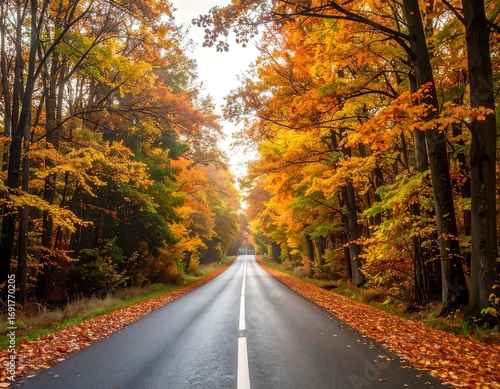 Autumnal road through a vibrant forest
