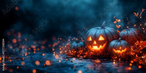 Autumnal scene showcases a glowing Jack-o'-lantern amidst fallen foliage, conjuring a Halloween spirit with eerie bokeh.