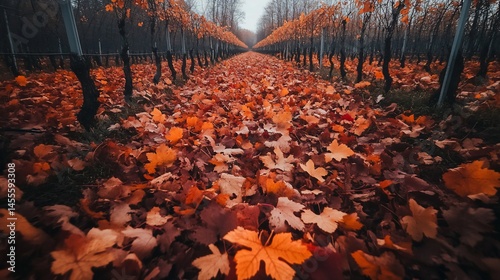 Autumnal vineyard path covered in vibrant fall leaves