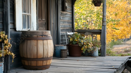Autumn's Charm Porch View with Barrel and Fall Foliage