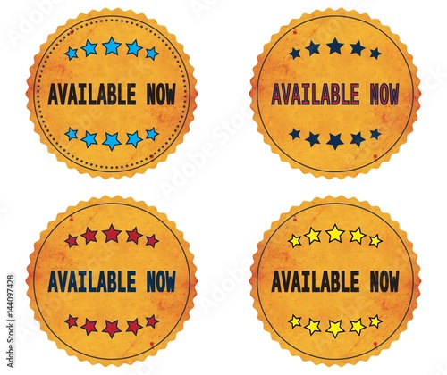 AVAILABLE NOW text, on round wavy border vintage, stamp badge.