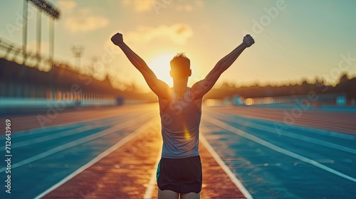 Avictorious unrecognizable athlete man, raising their arms in celebration at the finish line of a race triumphal