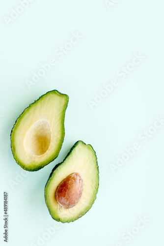 Avocado on blue background. Top view. Banner. Pop art design, creative summer food concept. Green avocadoes, minimal flat lay style.