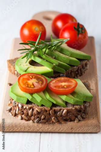 Avocado toast, cherry tomato on wooden background. Breakfast with toast avocado, vegetarian food, healthy diet concept.