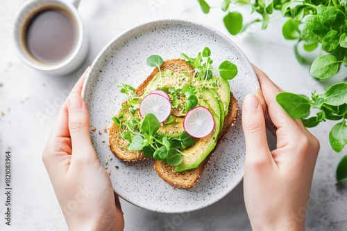 Avocado toast with radish slices and microgreens on ceramic plate held by hands, accompanied by cup of coffee and fresh green leaves, creating fresh and healthy breakfast scene