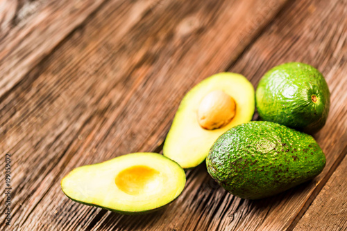 Avocados cut and whole on a wooden background