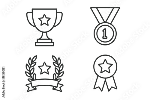 Award and achievement vector line icon set. Winner trophy cup, first place medal, champion laurel wreath with star, victory ribbon symbol. Success outline pictograms.