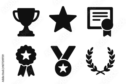 Award icon set. Victory and success symbols. Trophy, medal, star, certificate, laurel wreath, and ribbon. First place champion prize. Quality guarantee seal. Glyph icons.