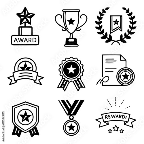 Award Icons Set Trophies, Medals, Certificates & Ribbons in Black and White