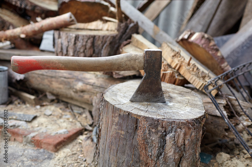 Ax in the stump. Axe for cutting wood. Preparation of firewood for the winter. Selective focus, blurred background