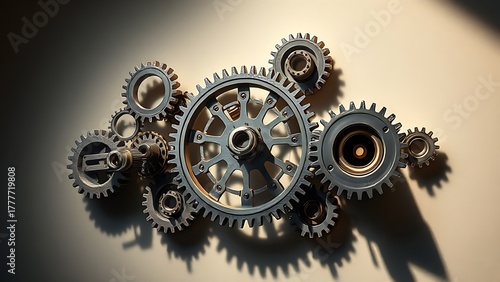 axle. Mechanical gear system concept, abstract metallic components with dramatic shadows. safety posters, maintenance manuals, designed for industrial assembly lines and welding operations.