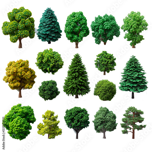 Axonometric bird's eye view of different trees, real photo. White background