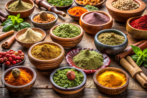 Ayurvedic medicinal powders in clay bowls, arranged with holistic healing tools
