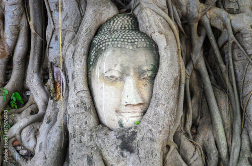 AYUTTHAYA, THAILAND - August, 2016: Head of Buddha statue in the tree roots at Wat Mahathat temple, Ayutthaya, Thailand