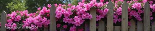 Azaleas blooming with pink and purple flowers on a wooden fence , nature, flowers, garden