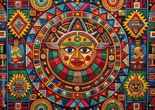 Aztec Mayan Tapestry: Vibrant colors, ancient motifs, geometric patterns, intricate textures, cultural heritage
