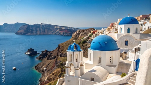 Azure Domes: A picturesque view of iconic Greek architecture, white buildings adorned with vibrant azure domes, nestled along the cerulean coastline under a bright, sunlit sky.