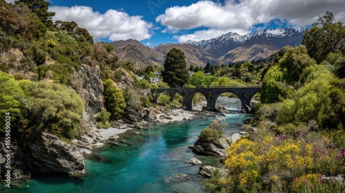 Azure River Winding Through Mountain Valley with Stone Arch Bridge