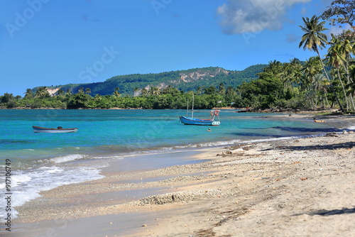 Azure, turquoise blue colored shallow lagoon of Playa Manglito Beach lined with sea almond and palm trees, c.30 km east of the city. Baracoa-Cuba-594