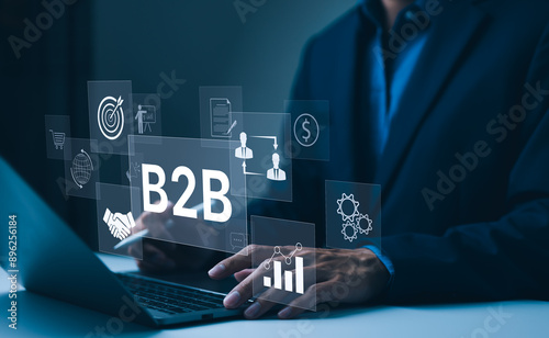 B2B business strategy concept. Businessman working with B2B virtual on laptop, conceptualizing strategy, partnership, targets in business to business services. E-commerce, B2B Marketing, enterprise,