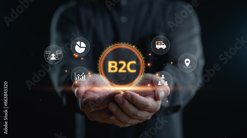 B2C concept, business to customer concept, Business person hands show B2C business to customer icon on virtual screen. marketing strategy cooperation communication finance concept.