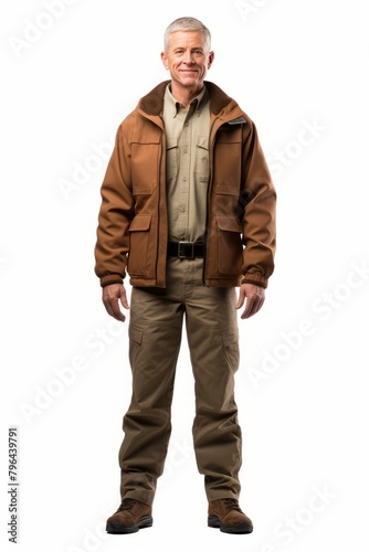 b'A man wearing a brown jacket, khaki pants, and brown boots.'