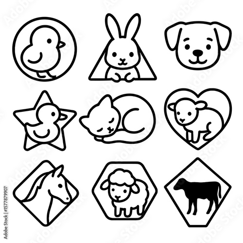 Baby Animal Icons. Line style icons of baby animals with basic shapes: baby chick in circle, baby bunny in triangle, puppy head in