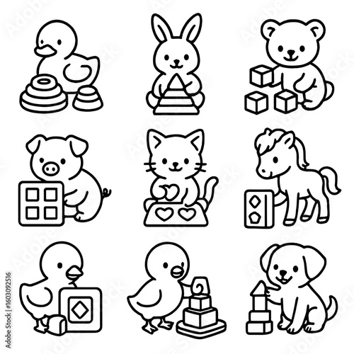 Baby Animal Shape Toys. Line style icons of baby animal stacking and sorting toys: duckling sorting circles, bunny stacking