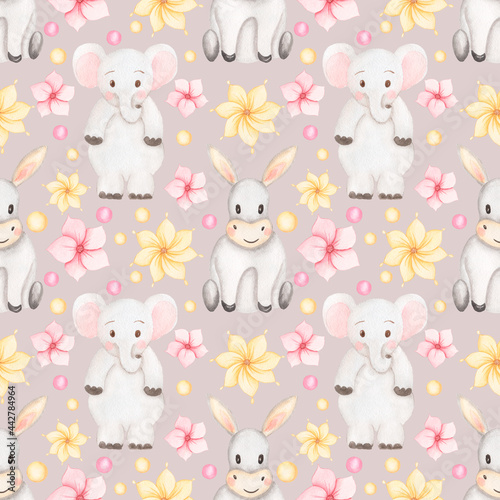 Baby animals seamless pattern, Watercolor hand drawn kids paper, elephant repeat paper, cute donkey print, children pattern, nursery design