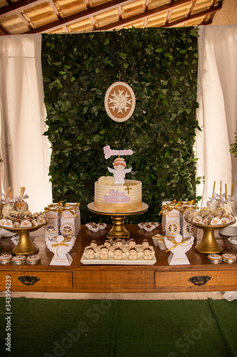 Baby baptism. Cake table with sweets and decoration