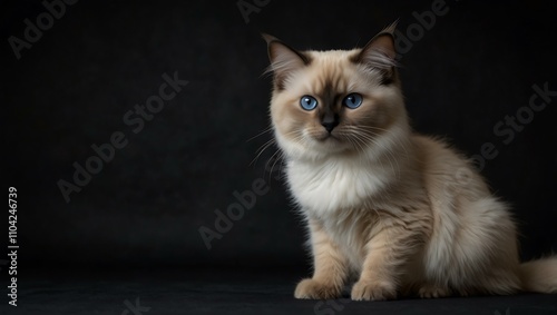 Baby Birman cat standing with copy space on the right, isolated on black.