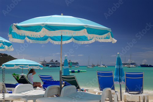 Baby Blue beach umbrellas at Great Bay Philipsburg with girl
