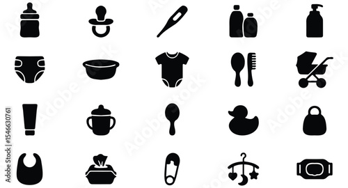 Baby care silhouette icon set – diaper, stroller, bottle, pacifier, rubber duck, and baby item