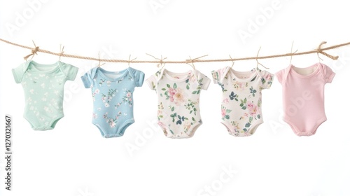 Baby clothes hanging on rope, isolated on white