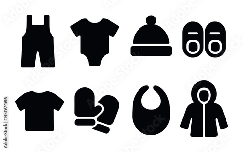 Baby clothes solid icons set – filled, silhouette, infant apparel and accessories