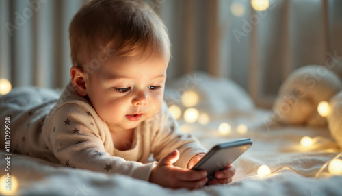 Baby exploring smartphone while lying on bed surrounded by warm lights in a cozy indoor setting