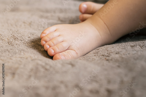 Baby feet on coverlet. Toes. Horizontal photo. Close-up.