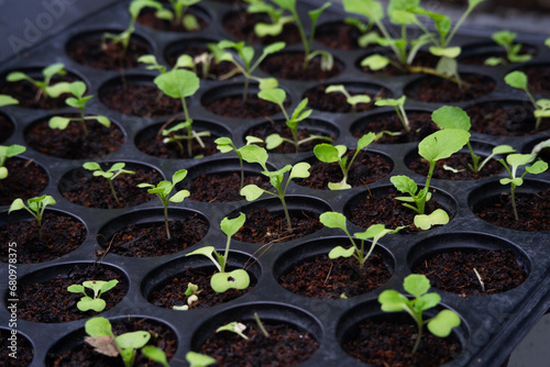 Baby fresh green vegetable growing ,organic salad, vegetable in the black plastic tray , growning vegetable out door.