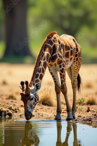 Baby giraffe drinking from watering hole in African savannah, water, wild