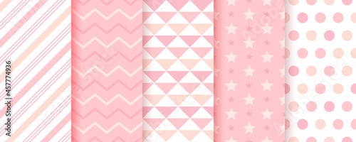 Baby girl backgrounds. Cute seamless pattern. Pastel pink geometric textures. Childish prints with zigzag, candy cane stripes, triangles, polka dot and star. Set of kids backdrops. Vector illustration