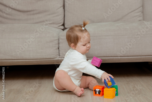 baby girl sitting at home on the floor playing cubes, child development