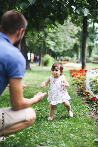 baby girl taking first steps towards father in summer park, surrounded by green trees and blooming flowers, joyful and emotional moment concept of childhood, vertical