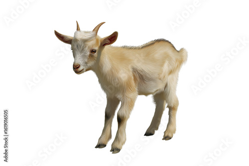 Baby goat with small horns and curious expression, full body, no ground shadow, isolated