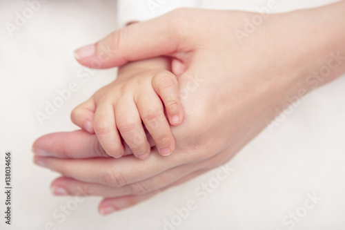 Baby hand gently holding adult's finger (Soft focus and blurry)