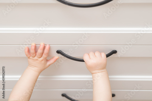 Baby hand holding handle and open or close white drawer at home room. Closeup. Point of view shot.