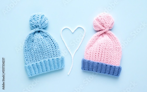 Baby Hats in Blue and Pink with a Yarn Heart Shape